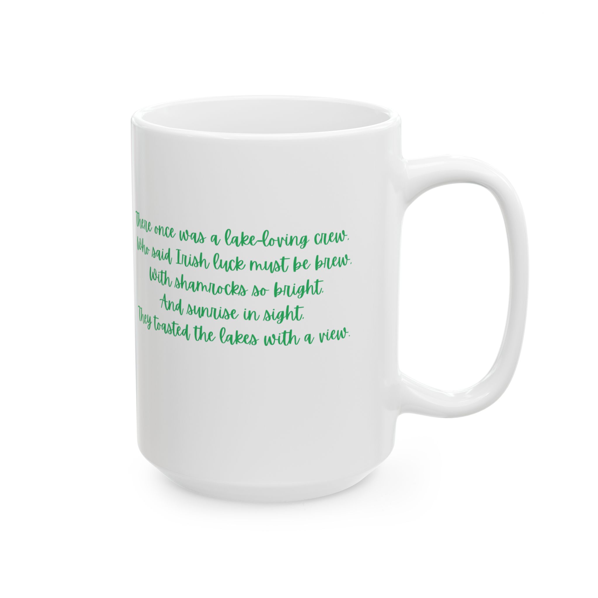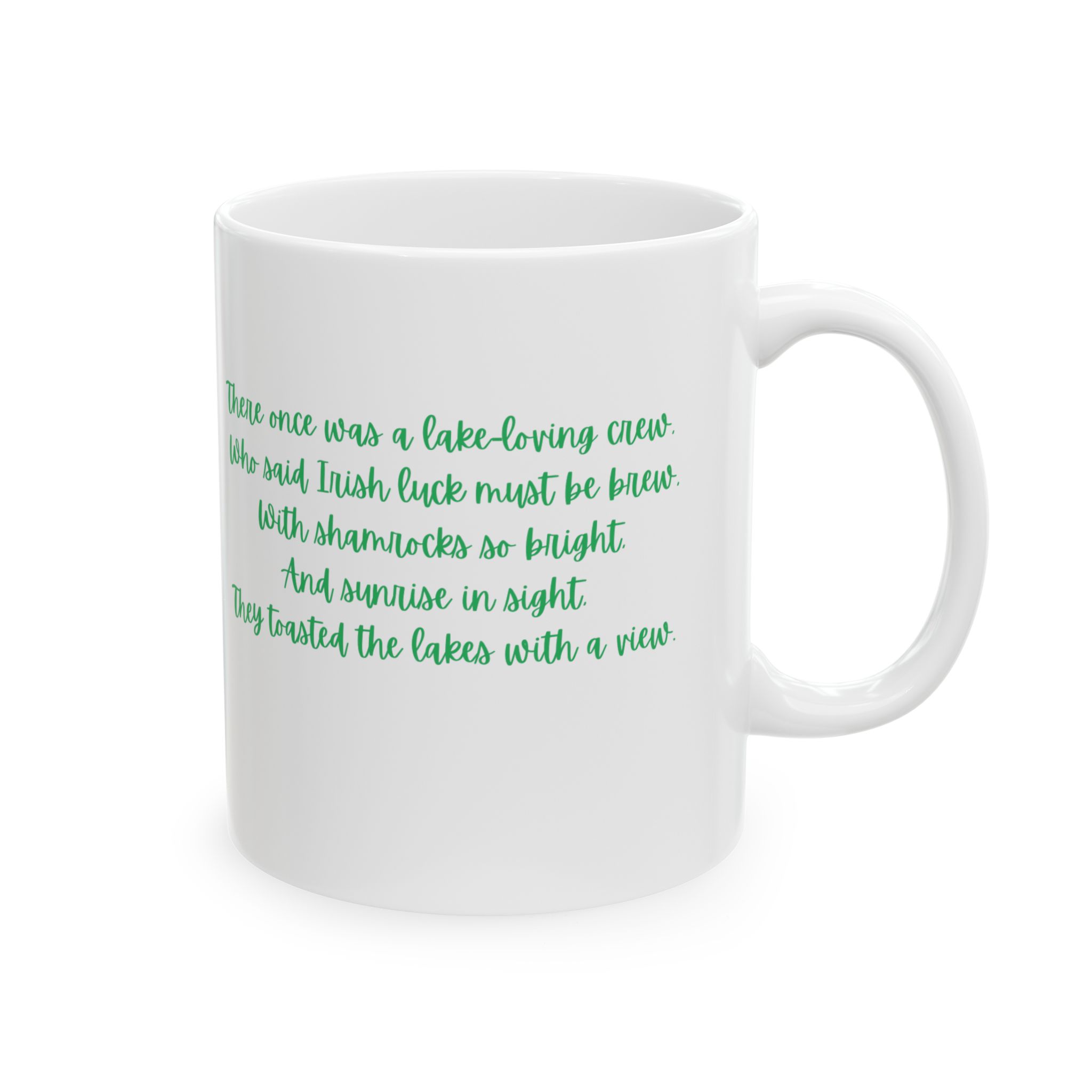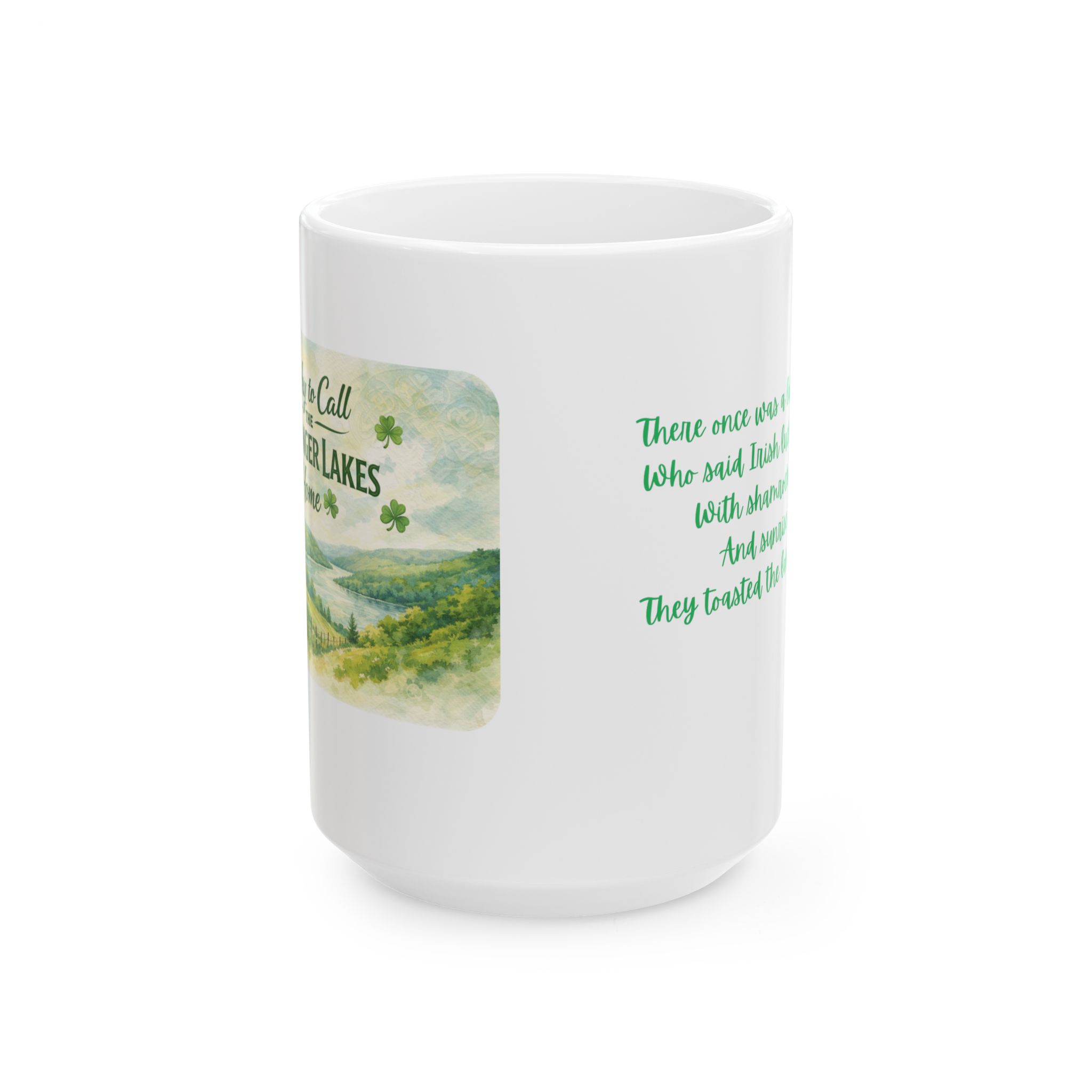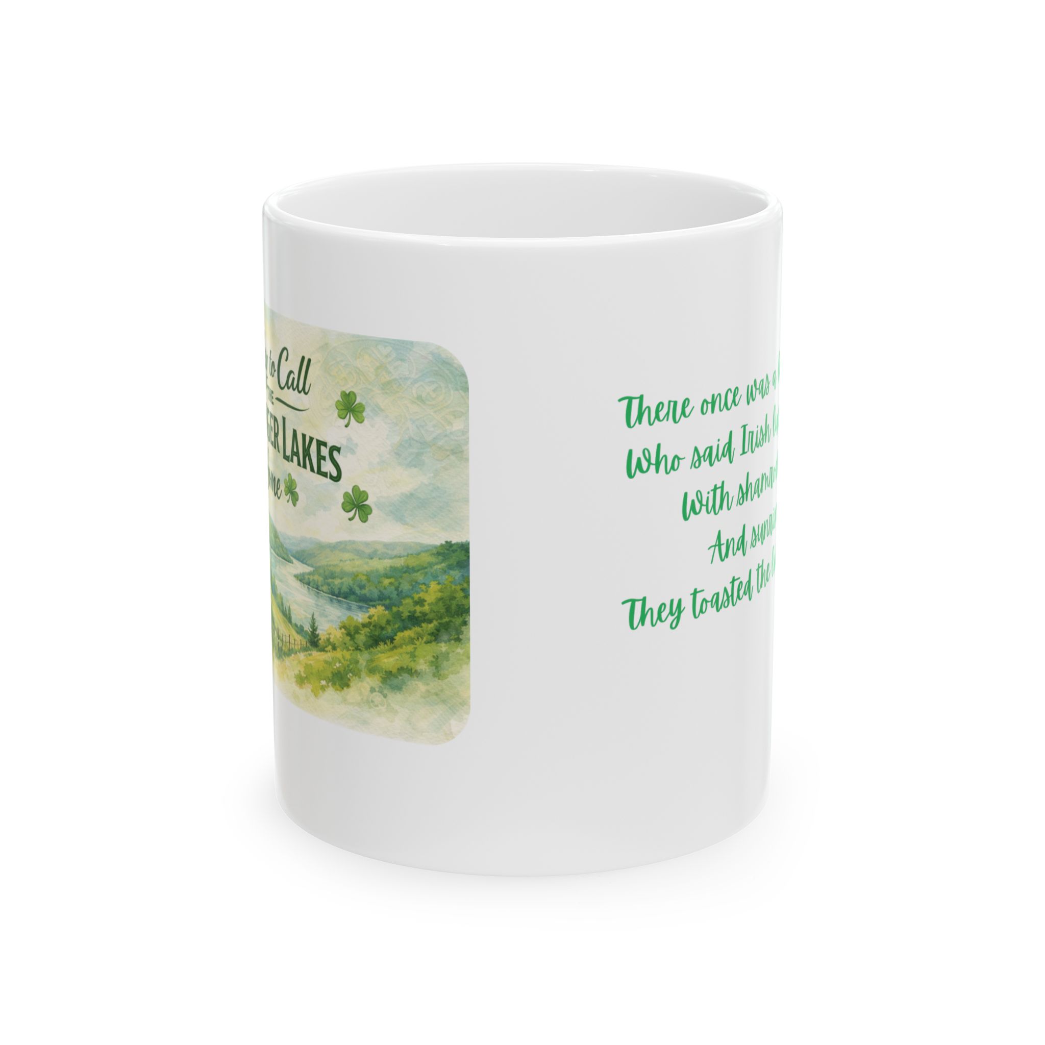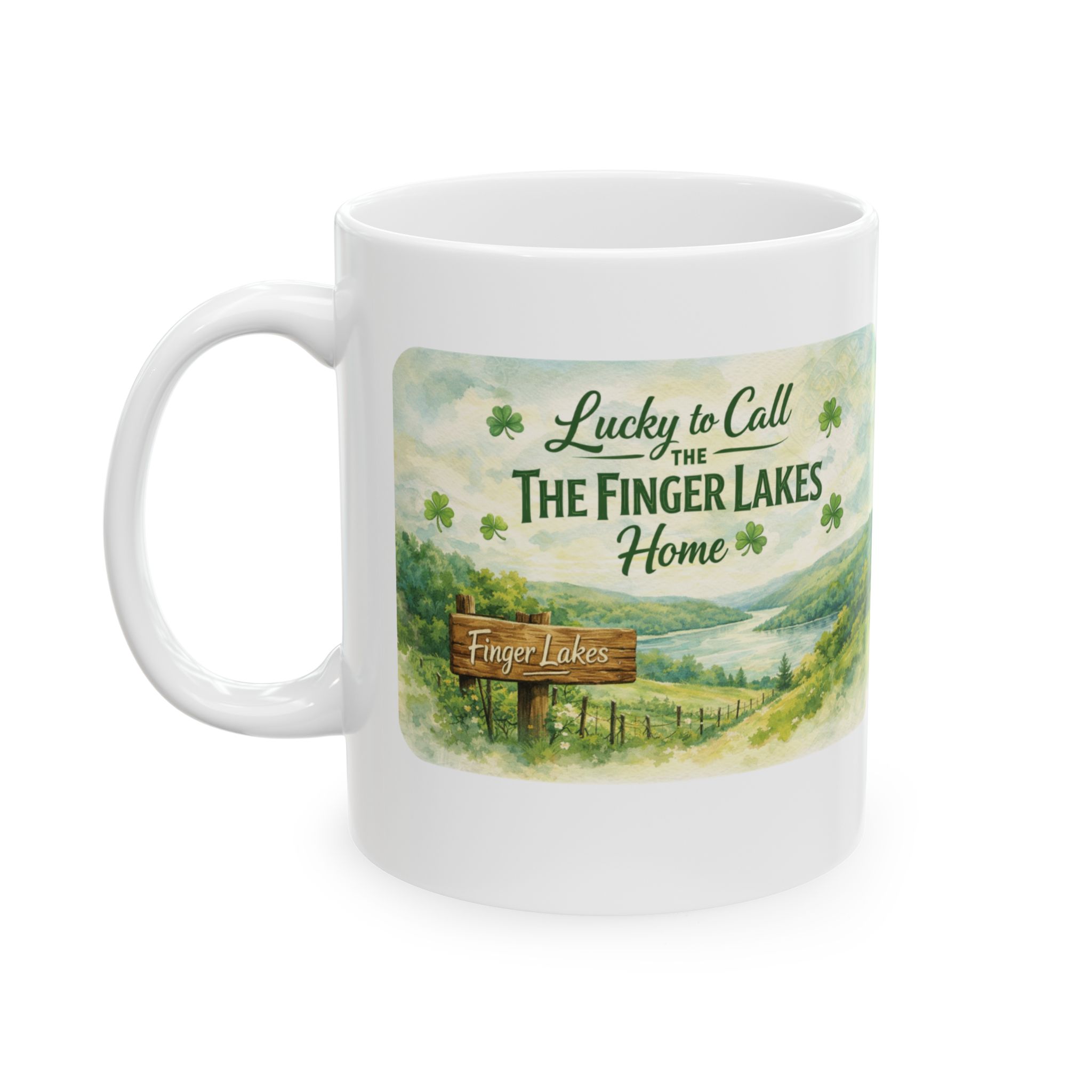 This beautifully designed ceramic mug features a soft watercolor illustration of the Finger Lakes on the front — rolling green hills, peaceful waters, and festive shamrocks celebrating St. Patrick’s Day in true local style.